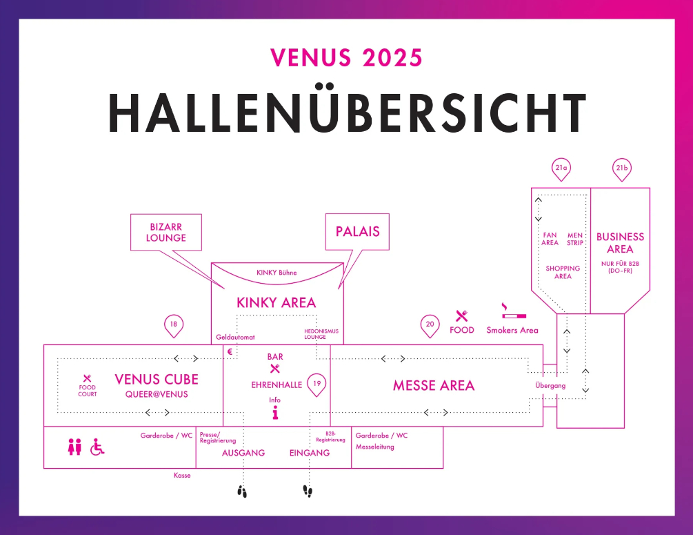Messe-Area – Die Messe-Area, Halle 18 und Halle 20, ist der wohl grösste und abwechslungsreichste Bereich der Venus. Neben zahlreichen Attraktionen und Shows erwartet die Besucher auch eine grosse Auswahl an erotischen Produkten und Marken, die sich auf der Venus präsentieren. Auch können die Besucher hier die Stars der Venus hautnah erleben – egal ob auf der Bühne,… beim Fotoshooting,… oder bei einer der vielen Autogrammstunden!